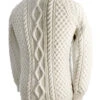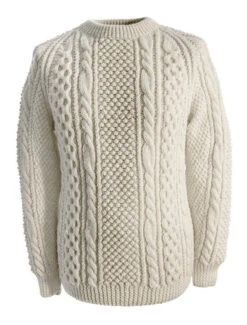 The hand knit Higgins sweater incorporates honeycomb cable and blackberry stitches. The honeycomb stitch represents work â the industriousness of the bees. The cable symbolises luck and the blackberry stitch represents the Holy Trinity. This beautiful Aran sweater has been hand knitted in the traditional bĂĄinĂn (pronounced âbaw neenâ) colour, the natural white of the wool. It comes to you complete with a clan history and crest. It is made of 100% pure new wool, is water repellent and breathable. It has been hand crafted in the traditional Irish style, and, with care, will last a lifetime.