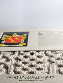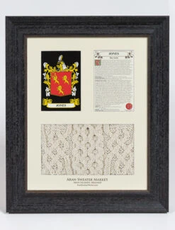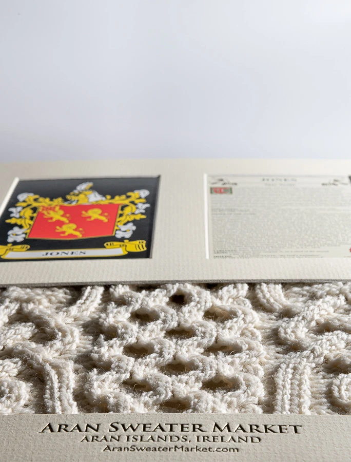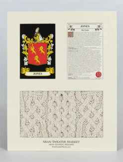 The Jones Clan Aran & History Display is a wonderful item of Jones heritage which can be proudly displayed in your home or place of work to demonstrate the pride your have in your Jones name.
