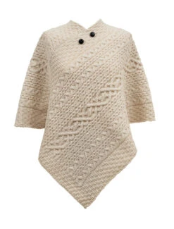 The Kane Clan Aran Poncho has an unusual cable plait centre stitch, flanked by plait, cable and moss stitches on either side. The cable stitch represents a wish for good luck, and moss stitch represents nature. This beautiful Aran poncho has been knit in the traditional báinín (pronounced ‘baw neen’) colour, the natural white of the wool. It comes to you complete with a clan history and crest. It is made of 100% pure new wool, is water repellent and breathable.