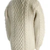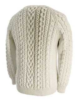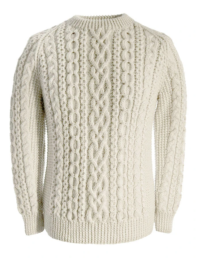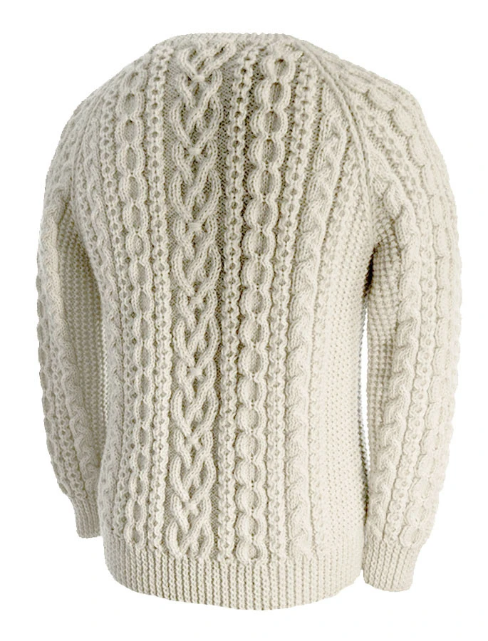 The Kane sweater has an unusual cable plait centre stitch, flanked by plait, cable and moss stitches on either side. The cable stitch represents a wish for good luck, and moss stitch represents nature. This beautiful Aran sweater has been hand knitted in the traditional báinín (pronounced ‘baw neen’) colour, the natural white of the wool. It comes to you complete with a clan history and crest. It is made of 100% pure new wool, is water repellent and breathable. It has been hand crafted in the traditional Irish style, and, with care, will last a lifetime.