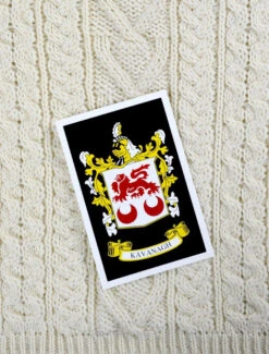 This beautiful Kavanagh Clan Aran Throw (measuring 64″ by 40″) has been produced in the traditional báinín (pronounced ‘baw neen’) colour, the natural white of the wool. It comes to you complete with a clan history and crest.