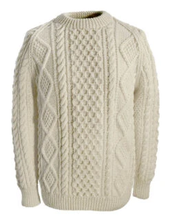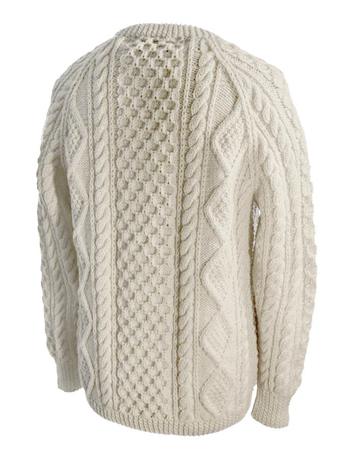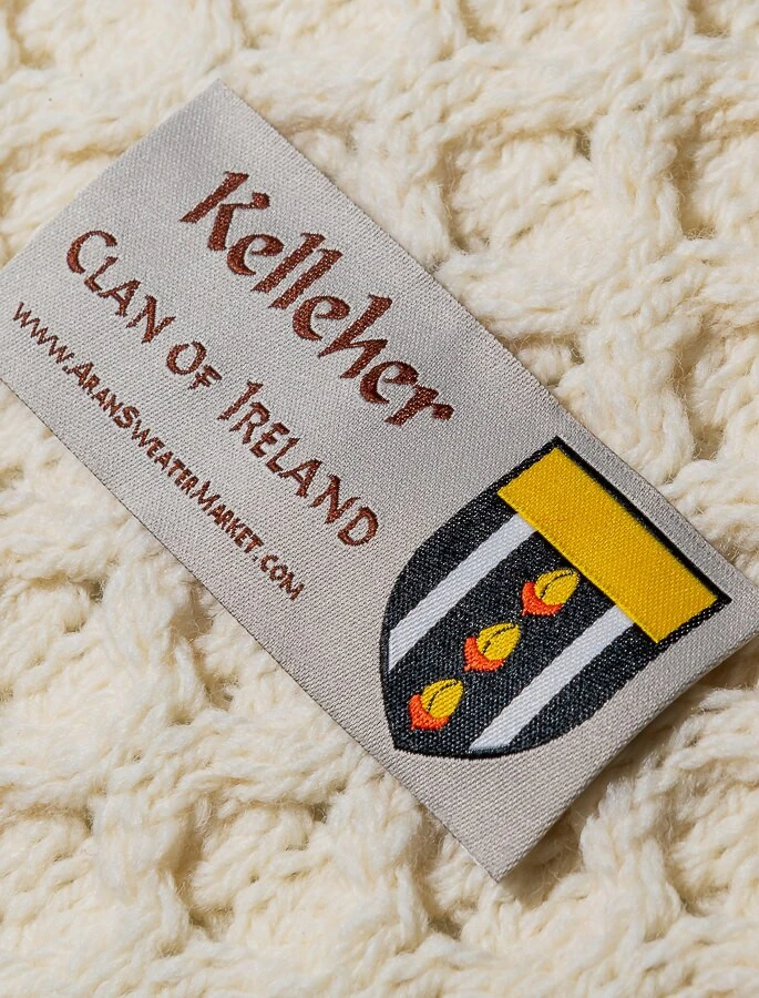 The hand knit Kelleher sweater has a central honeycomb panel, flanked by cable and moss filled diamonds on both sides. The honeycomb pattern represents work. The cable symbolises a wish for good luck while the diamonds represent a wish for wealth. This beautiful hand knitted Aran sweater has been hand knitted in the traditional bĂĄinin (pronounced âbaw neenâ) colour, the natural white of the wool. It comes to you complete with a Clan history and crest. It is made of 100% pure new wool, is water repellent and breathable. It has been hand crafted in the traditional Irish style, and with care, will last a lifetime.