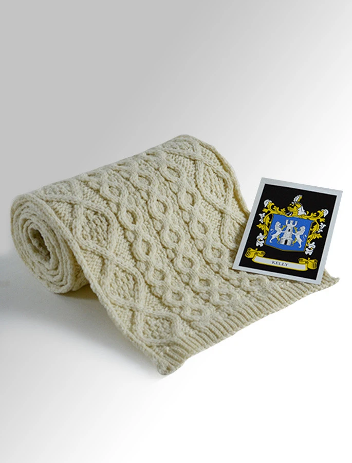 The Kelly Clan Aran Scarf is a wonderful item of Kelly heritage which will be cherished by the wearer for generations to come. Lovingly crafted from the finest 100% soft new wool, this Aran wool scarf has been created following the unique Kelly Clan Aran pattern.
