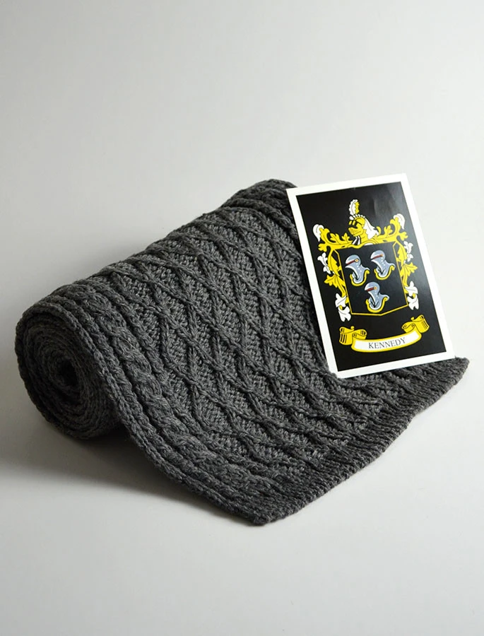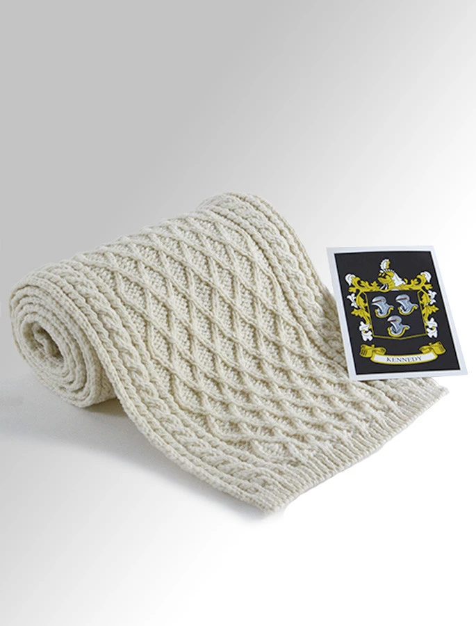 The Kennedy Clan Aran Scarf is a wonderful item of Kennedy heritage which will be cherished by the wearer for generations to come. Lovingly crafted from the finest 100% soft new wool, this Aran wool scarf has been created following the unique Kennedy Clan Aran pattern.