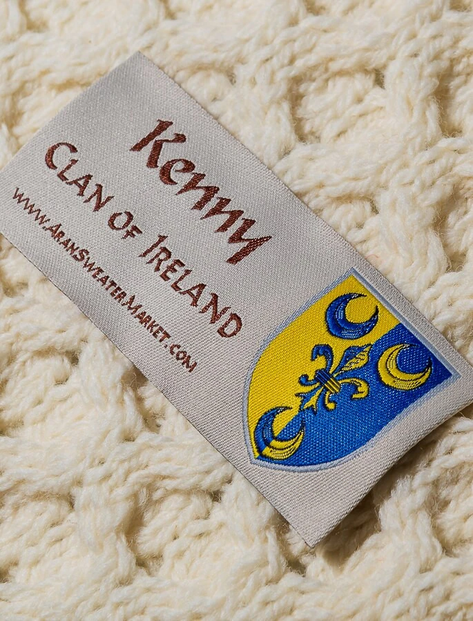 The name Kenny comes from the personal name Cionaodh. It was borne by a high king of Ireland seems to have become popular from the Eighth Century in Ireland. The majority of the people with the name Kenny belong to families located in counties Galway and Roscommon. The hand knit Kenny sweater has a trellis central pattern flanked by cables and honeycomb rope. The side panels and sleeves have the blackberry stitch. The trellis stitch represents the stone walled fields of the Aran Islands. The blackberry stitch is symbolic of the holy trinity and the cables represent good luck. This beautiful Aran sweater has been hand knitted in the traditional báinin (pronounced ‘bawneen’) colour, the natural white of the wool. It comes to you complete with a Clan History and Crest. It is made of 100% pure new wool, is water repellent and breathable. It has been handcrafted in the traditional Irish style, and, with care, will last a lifetime.