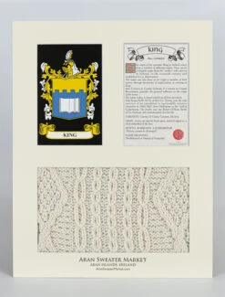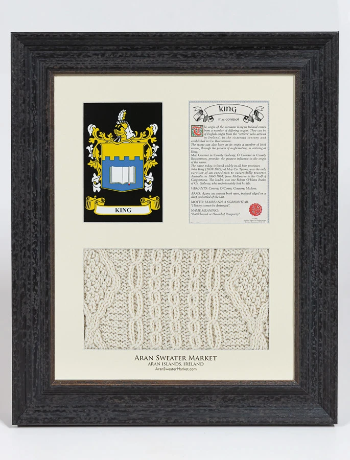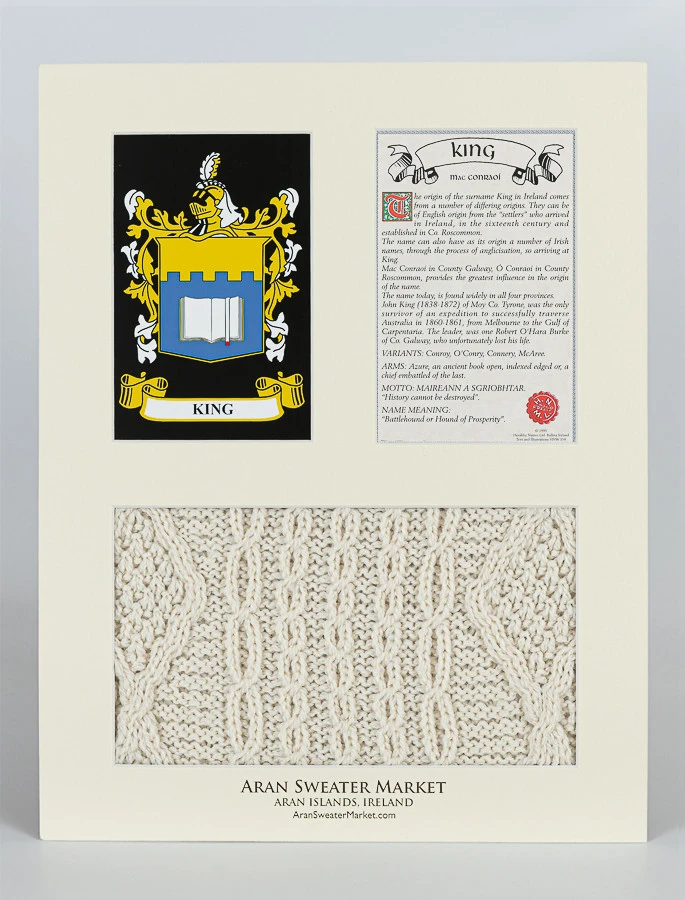 The King Clan Aran & History Display is a wonderful item of King heritage which can be proudly displayed in your home or place of work to demonstrate the pride your have in your King name.