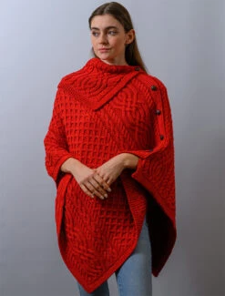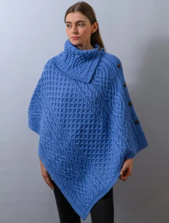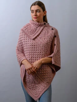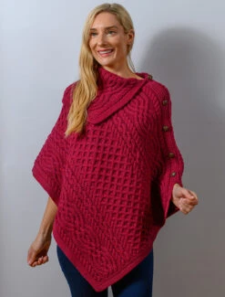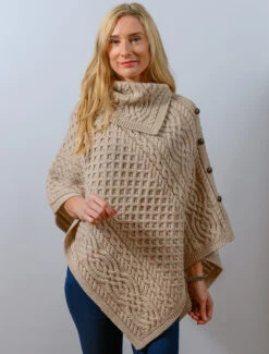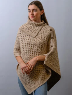 Our beautifully detailed Merino Poncho with leather-look buttons is the perfect Aran style for the season.