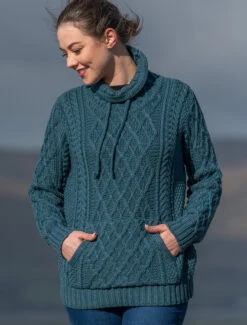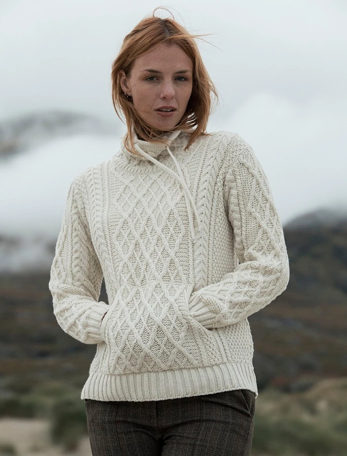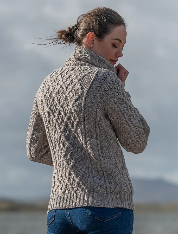 Warm, comfy, and cozy, this ladies Aran sweater is the perfect layer for when the temperature outside drops.