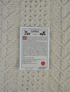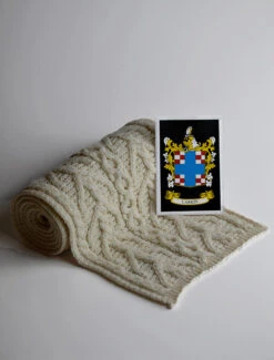 The Larkin Clan Aran Scarf is a wonderful item of Larkin heritage which will be cherished by the wearer for generations to come. Lovingly crafted from the finest 100% soft new wool, this Aran wool scarf has been created following the unique Larkin Clan Aran pattern.ย