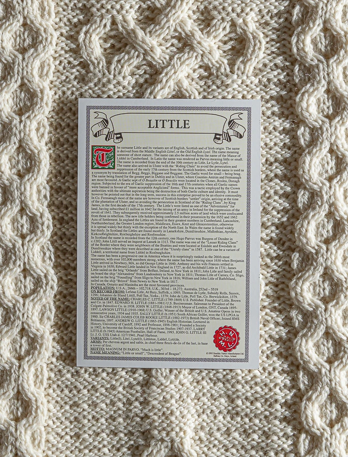 The Little Clan Aran Throw is a precious gift for any home wherein Little heritage proudly resides & will be cherished by families of the Little name for generations to come. Lovingly crafted from the finest 100% soft new wool, this Aran throw (measuring 64″ X 40″) has been created following the unique Little Clan Aran pattern.