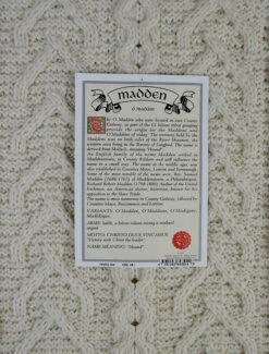 The Madden Clan Aran Scarf is a wonderful item of Madden heritage which will be cherished by the wearer for generations to come. Lovingly crafted from the finest 100% soft new wool, this Aran wool scarf has been created following the unique Madden Clan Aran pattern.