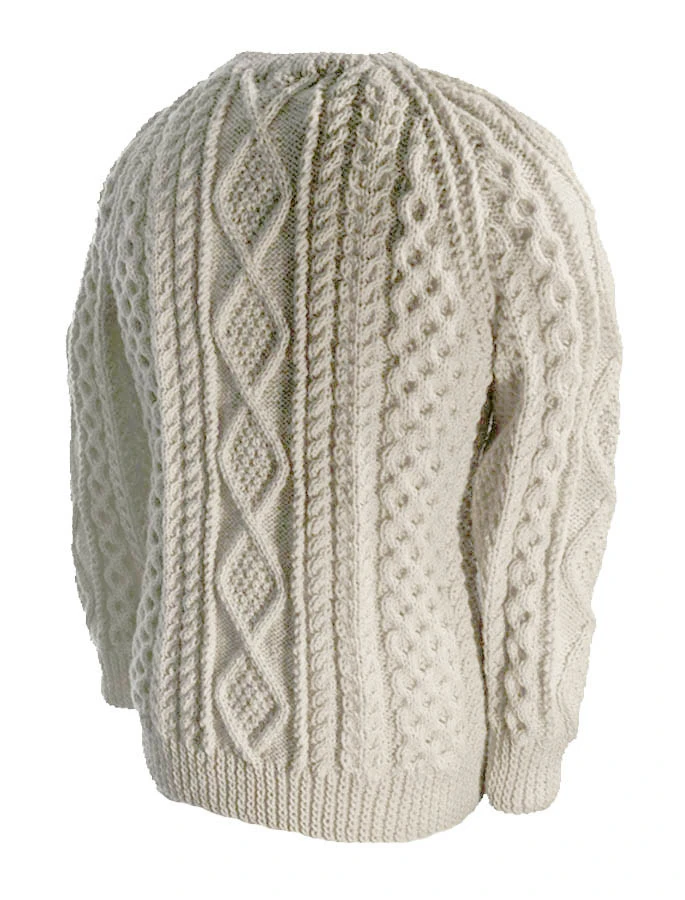 This sweater has a moss-filled diamond as the central panel, flanked by two cables, link, and a panel of honeycomb on either side. The diamond represents a wish for wealth, the cables symbolise luck, the link stands for the unbroken chain between the Irish who emigrate and those who remain at home, and the honeycomb represents work. This beautiful Aran sweater has been hand knitted in the traditional bĂĄinĂn (pronounced âbaw neenâ) colour, the natural white of the wool. It comes to you complete with a clan history and crest. It is made of 100% pure new wool, is water repellent and breathable. It has been hand crafted in the traditional Irish style, and, with care, will last a lifetime.