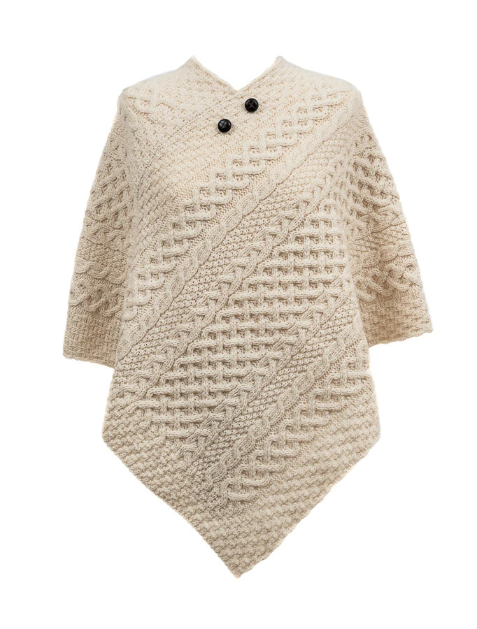 The Mc Dermott Clan Aran Poncho has a trellis centre panel, flanked by braid, and blackberry stitches on either side. The trellis represents the stone walled fields of the Aran Islands, and the blackberry stitch represents the Holy Trinity. This beautiful Aran poncho has been hand knitted in the traditional báinín (pronounced ‘baw neen’) colour, the natural white of the wool. It comes to you complete with a clan history and crest. It is made of 100% pure new wool, is water repellent and breathable.