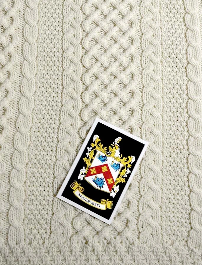 The Mc Dermott Clan Aran Throw is a precious gift for any home wherein Mc Dermott heritage proudly resides & will be cherished by families of the Mc Dermott name for generations to come. Lovingly crafted from the finest 100% soft new wool, this Aran throw (measuring 64″ X 40″) has been created following the unique Mc Dermott Clan Aran pattern.