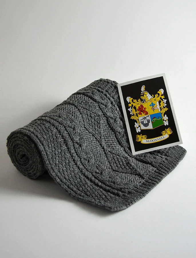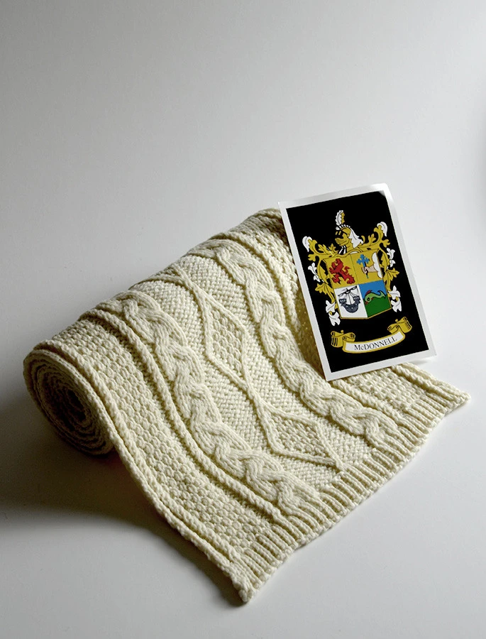 The Mc Donnell Clan Aran Scarf is a wonderful item of Mc Donnell heritage which will be cherished by the wearer for generations to come. Lovingly crafted from the finest 100% soft new wool, this Aran wool scarf has been created following the unique Mc Donnell Clan Aran pattern