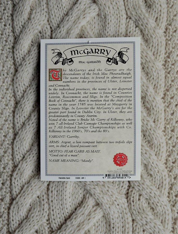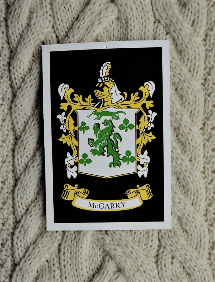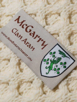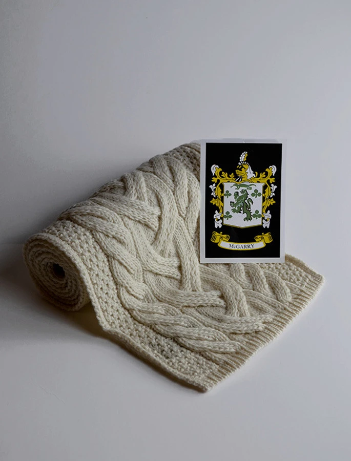 The McGarry Clan Aran Scarf is a wonderful item of McGarry heritage which will be cherished by the wearer for generations to come. Lovingly crafted from the finest 100% soft new wool, this Aran wool scarf has been created following the unique McGarry Clan Aran pattern.ย