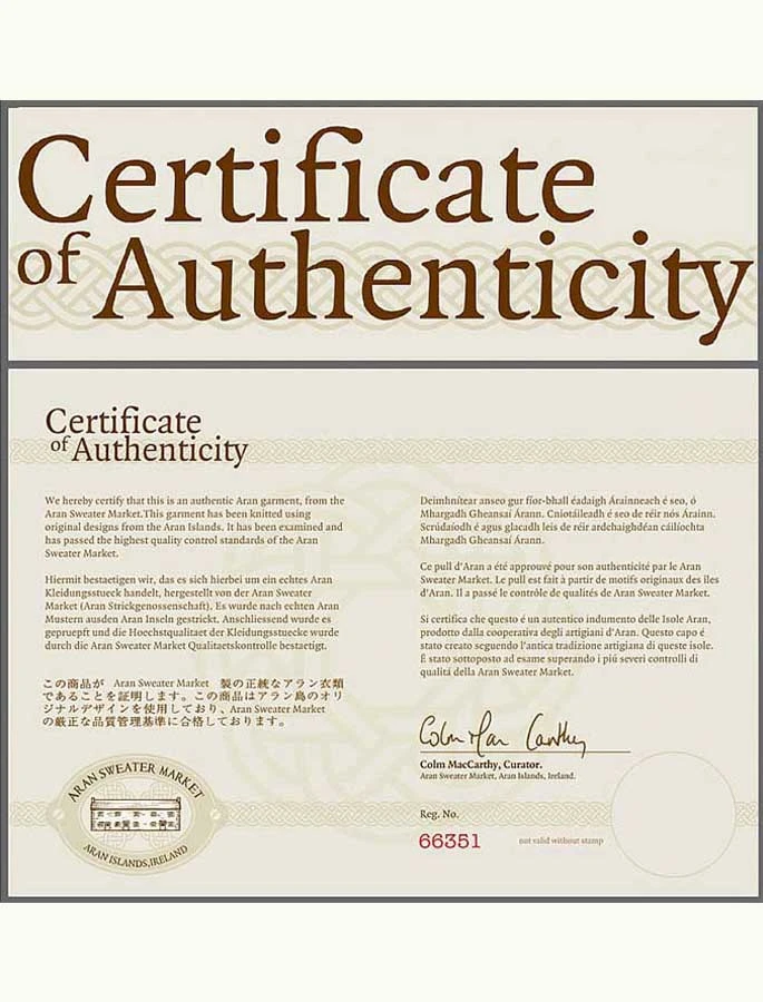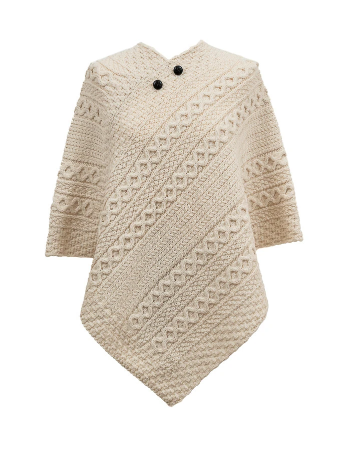 The Mc Grath Clan Aran Poncho has an unusual braided basket stitch centre panel, flanked by honeycomb rope, and blackberry panels on either side. The basket stitch is a wish for a full catch for the fisherman, the honeycomb stands for work and the blackberry stitch represents the Holy Trinity. This beautiful Aran poncho has been knit in the traditional báinín (pronounced ‘baw neen’) colour, the natural white of the wool. It comes to you complete with a clan history and crest. It is made of 100% pure new wool, is water repellent and breathable.