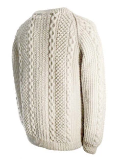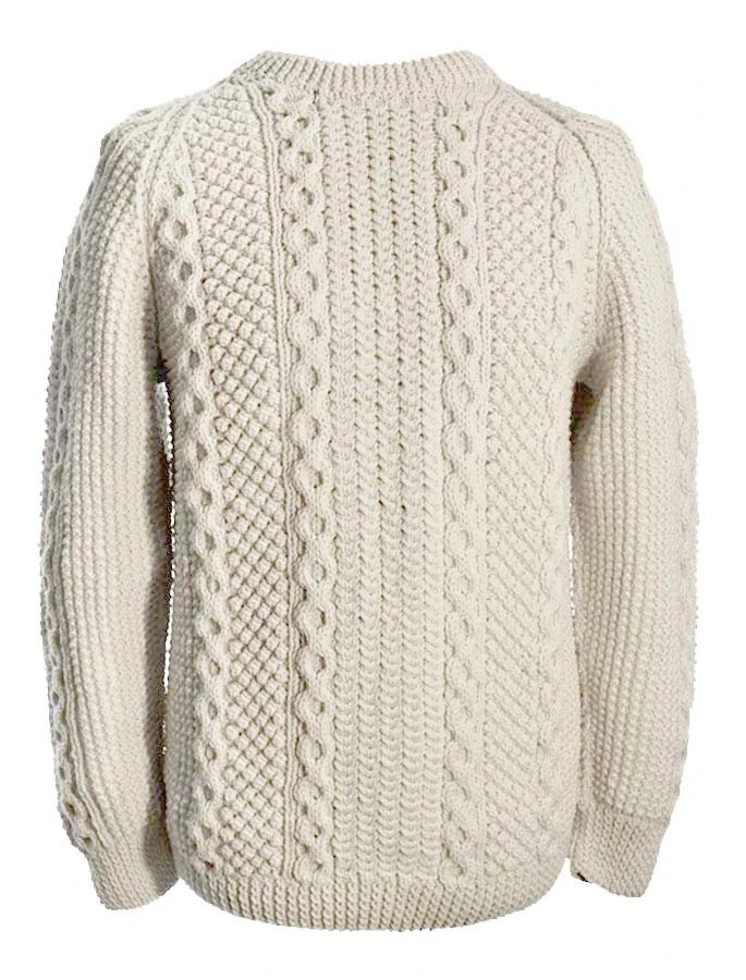 The hand knit Mc Grath sweater has an unusual braided basket stitch centre panel, flanked by honeycomb rope, and blackberry panels on either side. The basket stitch is a wish for a full catch for the fisherman, the honeycomb stands for work and the blackberry stitch represents the Holy Trinity. This beautiful Aran sweater has been hand knitted in the traditional bĂĄinĂn (pronounced âbaw neenâ) colour, the natural white of the wool. It comes to you complete with a clan history and crest. It is made of 100% pure new wool, is water repellent and breathable. It has been hand crafted in the traditional Irish style, and, with care, will last a lifetime.