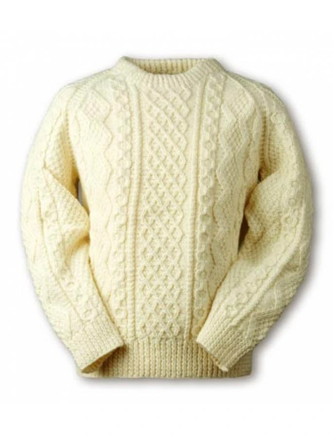 The hand knit Mc Kenna sweater has an unusual centre honeycomb cable stitch, flanked by cables and moss-filled diamonds on either side. The honeycomb represents work, the cables symbolise a wish for good luck and the diamonds are a wish for wealth. This beautiful Aran sweater has been hand knitted in the traditional báinín (pronounced ‘baw neen’) colour, the natural white of the wool. It comes to you complete with a clan history and crest. It is made of 100% pure new wool, is water repellent and breathable. It has been hand crafted in the traditional Irish style, and, with care, will last a lifetime.