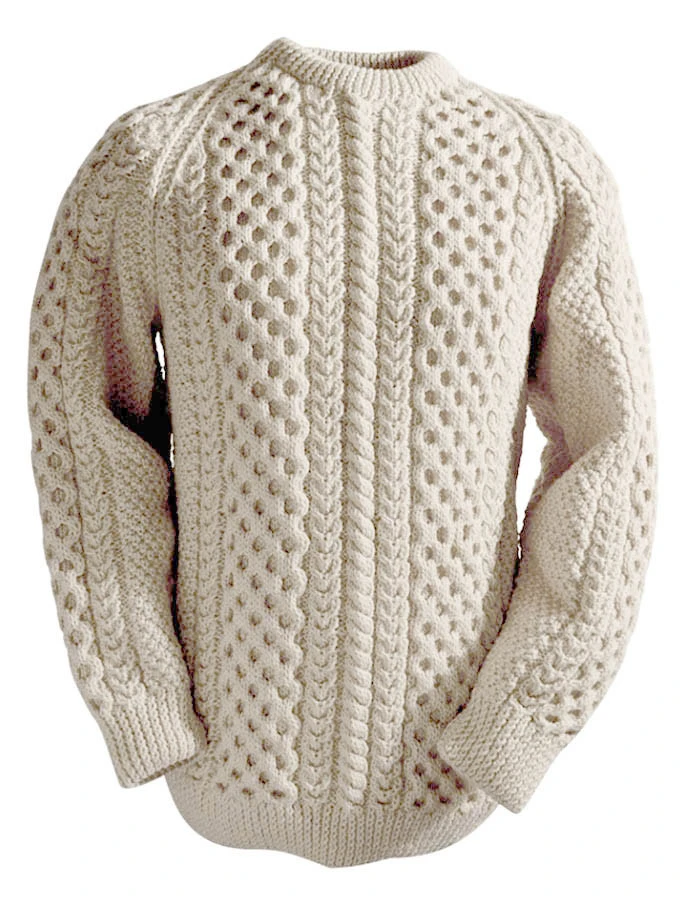This beautiful Aran sweater has been hand knitted in the traditional bĂĄinin (pronounced âbawneenâ) colour, the natural white of the wool. It comes to you complete with a Clan History and Crest. It is made of 100% pure new wool, is water repellent and breathable. It has been handcrafted in the traditional Irish style, and, with care, will last a lifetime.