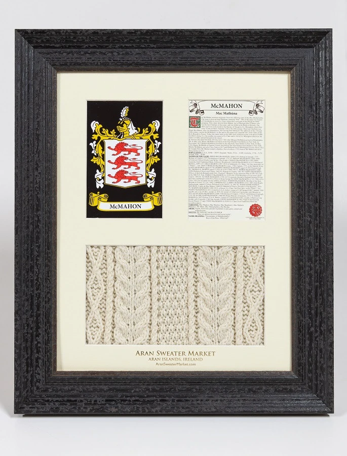 The Mc Mahon Clan Aran & History Display is a wonderful item of Mc Mahon heritage which can be proudly displayed in your home or place of work to demonstrate the pride your have in your Mc Mahon name.