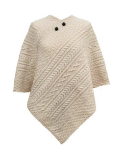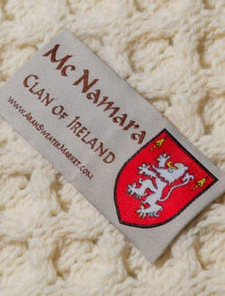 The McNamara Clan Aran Poncho incorporates braid, cable and blackberry stitches. The blackberry stitch represents the Holy Trinity , while the cable stitch symbolises luck. This beautiful Aran poncho has been knit in the traditional báinín (pronounced ‘baw neen’) colour, the natural white of the wool. It comes to you complete with a clan history and crest. It is made of 100% pure new wool, is water repellent and breathable.