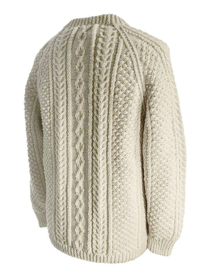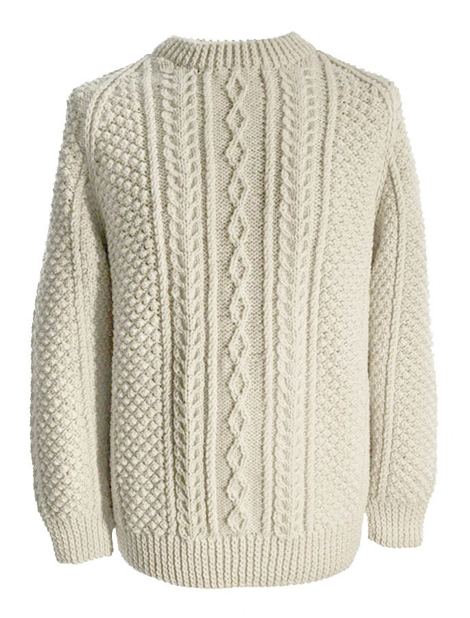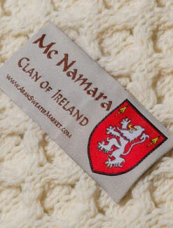 The hand knit McNamara sweater incorporates braid, cable and blackberry stitches. The blackberry stitch represents the Holy Trinity , while the cable stitch symbolises luck. This beautiful Aran sweater has been hand knitted in the traditional báinín (pronounced ‘baw neen’) colour, the natural white of the wool. It comes to you complete with a clan history and crest. It is made of 100% pure new wool, is water repellent and breathable. It has been hand crafted in the traditional Irish style, and, with care, will last a lifetime.