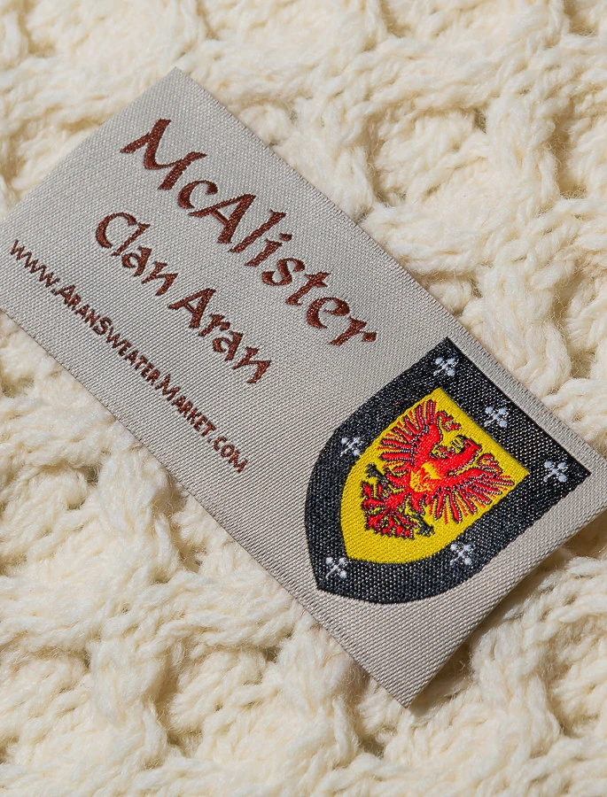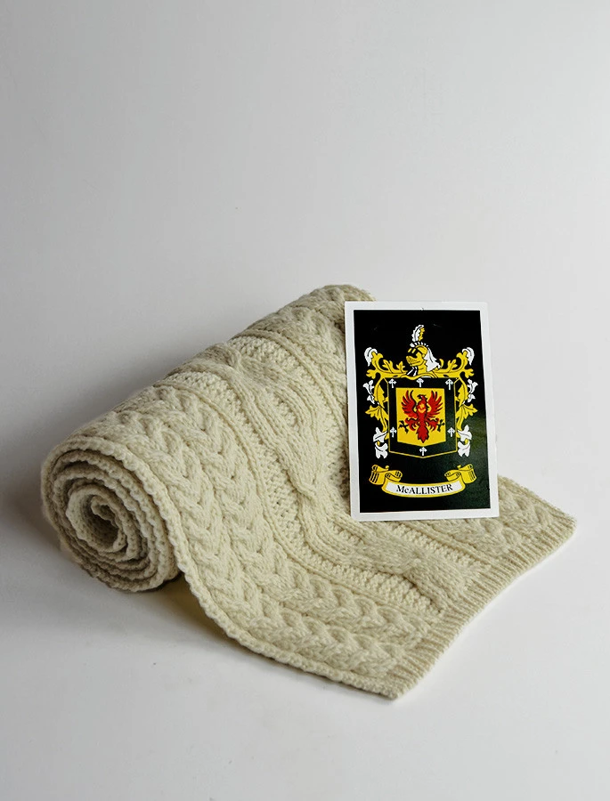 The McAllister Clan Aran Scarf is a wonderful item of McAllister heritage which will be cherished by the wearer for generations to come. Lovingly crafted from the finest 100% soft new wool, this Aran wool scarf has been created following the unique McAllister Clan Aran pattern.
