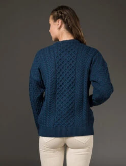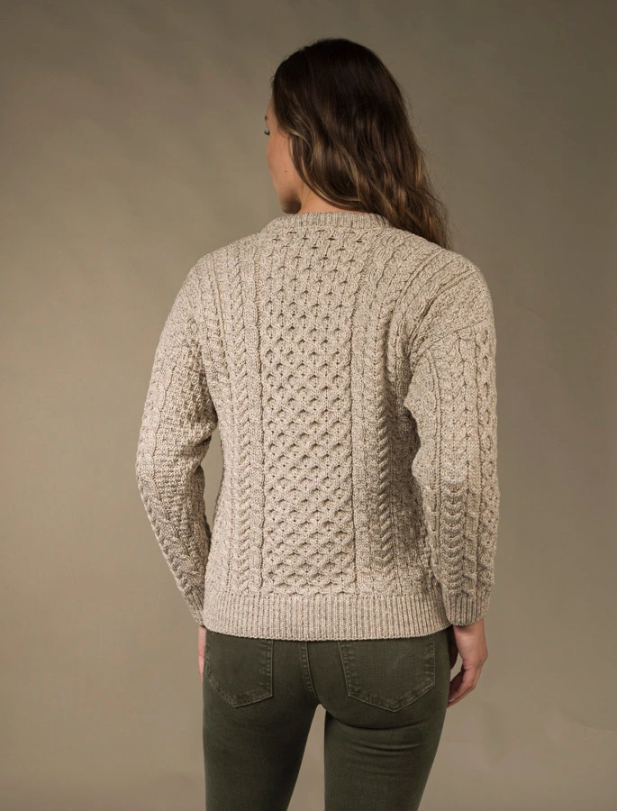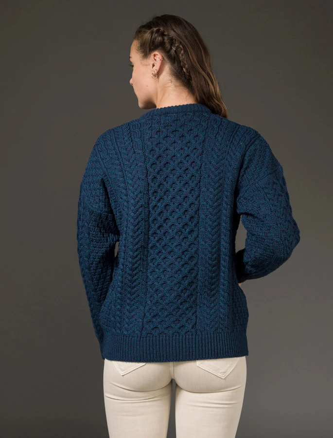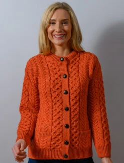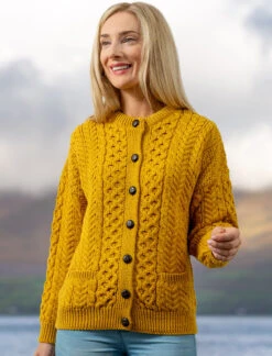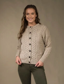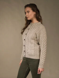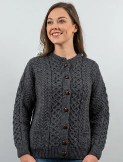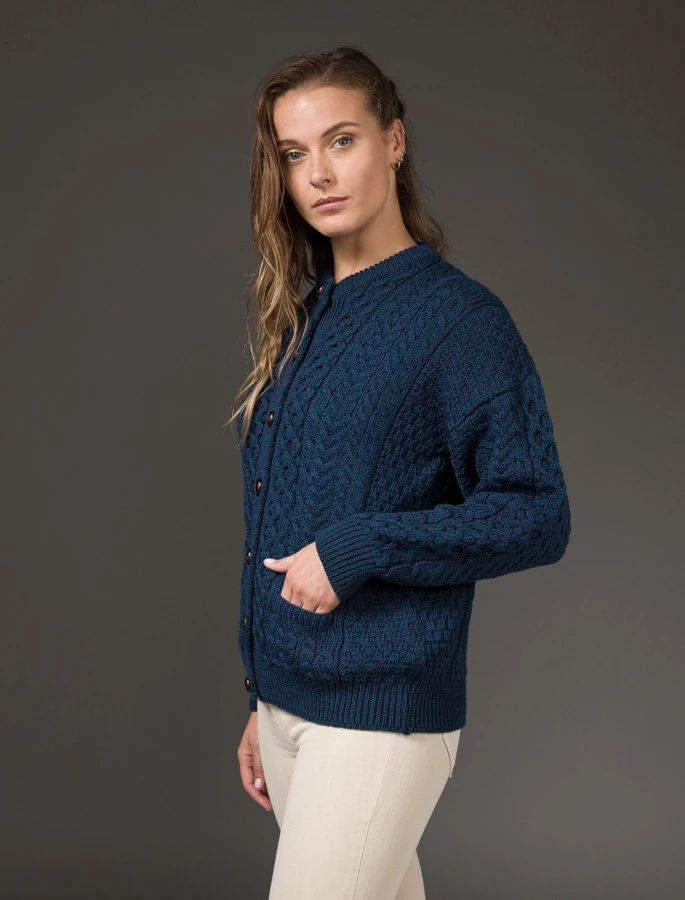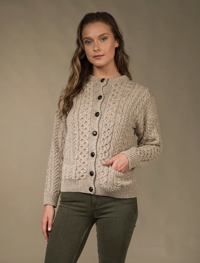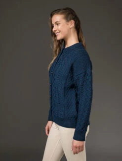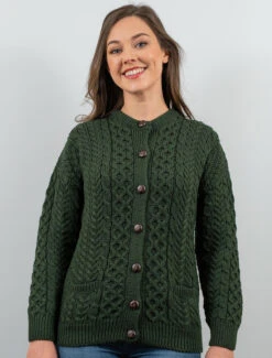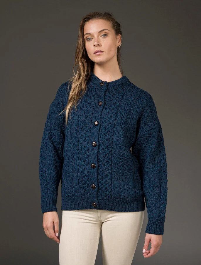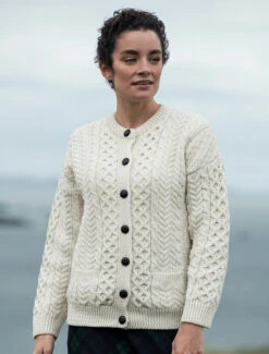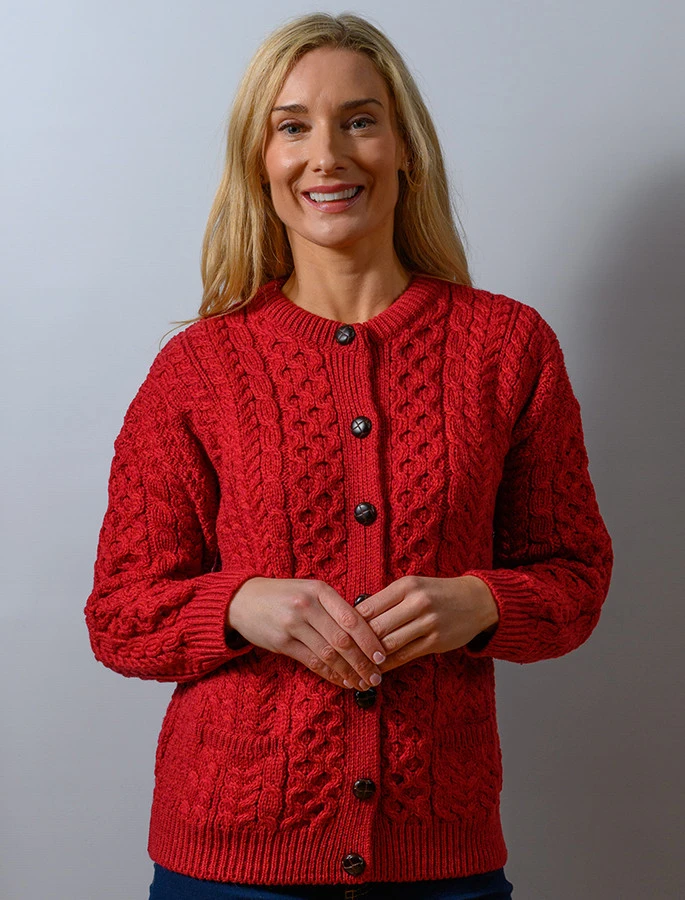 Our traditional Irish Aran Cardigan for women is made from 100% Merino Wool. This is a timeless and elegant classic featuring the ancient honeycomb stitch throughout. This high quality Cardigan is available in an array of colours from size XS to XXL.
