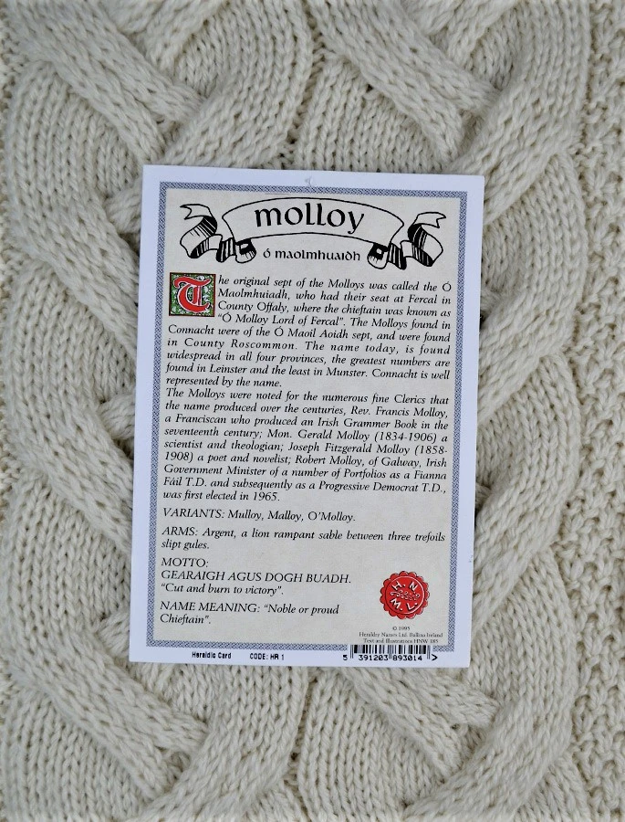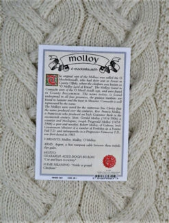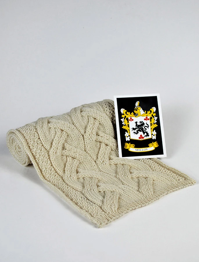 The Molloy Clan Aran Scarf is a wonderful item of Molloy heritage which will be cherished by the wearer for generations to come. Lovingly crafted from the finest 100% soft new wool, this Aran wool scarf has been created following the unique Molloy Clan Aran pattern.ย