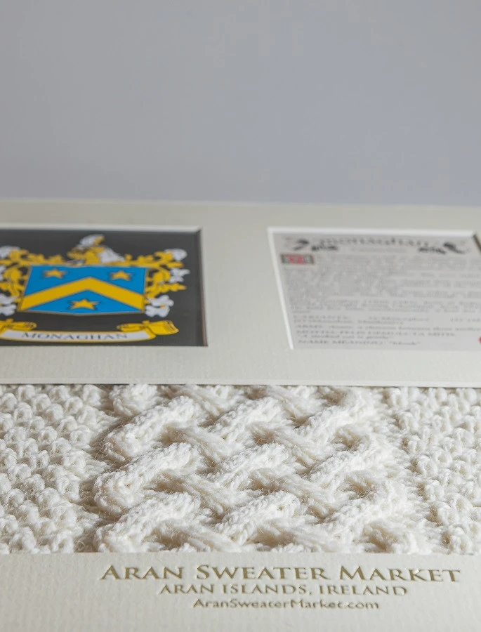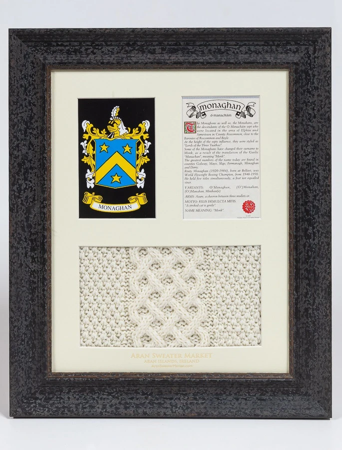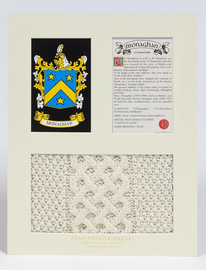 The Monaghan Clan Aran & History Display is a wonderful item of Monaghan heritage which can be proudly displayed in your home or place of work to demonstrate the pride your have in your Monaghan name.