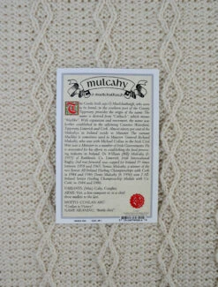 The Mulcahy Clan Aran Throw is a precious gift for any home wherein Mulcahy heritage proudly resides & will be cherished by families of the Mulcahy name for generations to come. Lovingly crafted from the finest 100% soft new wool, this Aran throw (measuring 64″ X 40″) has been created following the unique Mulcahy Clan Aran pattern.
