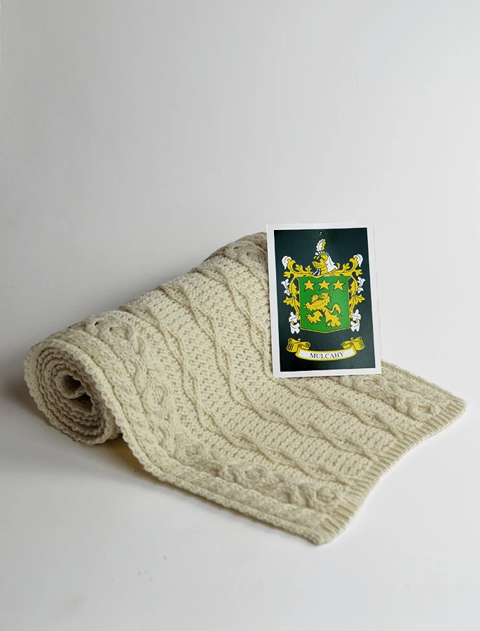 The Mulcahy Clan Aran Scarf is a wonderful item of Mulcahy heritage which will be cherished by the wearer for generations to come. Lovingly crafted from the finest 100% soft new wool, this Aran wool scarf has been created following the unique Mulcahy Clan Aran pattern.