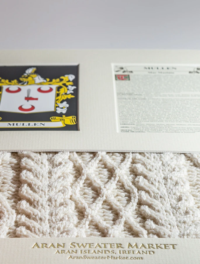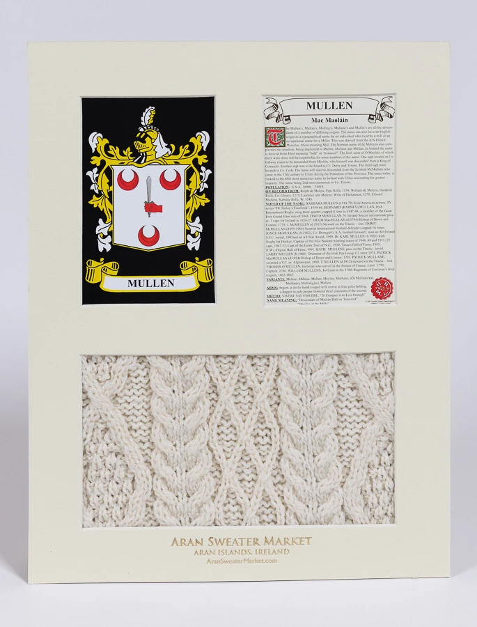 - Lovingly handcrafted & using the finest 100% soft new wool, thisĀ Mullen Clan Aran & History Display has been created following the historic family pattern of your clan.