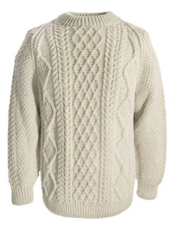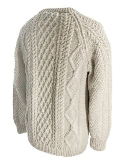The hand knit Mullen sweater has a trellis centre panel, flanked by link, cable and moss-filled diamonds on either side. The trellis represents the stone walled fields of the Aran Islands, the link stitch represents the unbroken chain between the Irish who emigrate and those who remain at home, the cable symbolises a wish for good luck, and the diamonds are a wish for wealth. This beautiful Aran sweater has been hand knitted in the traditional bĂĄinĂn (pronounced âbaw neenâ) colour, the natural white of the wool. It comes to you complete with a clan history and crest. It is made of 100% pure new wool, is water repellent and breathable. It has been hand crafted in the traditional Irish style, and, with care, will last a lifetime.
