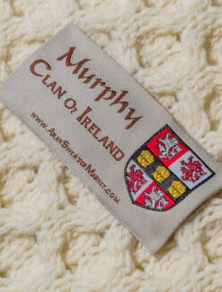 The honeycomb stitch symbolises work, and the diamonds represent a wish for wealth. This beautiful Murphy Clan Aran Throw (measuring 64″ by 40″) has been produced in the traditional báinín (pronounced ‘baw neen’) colour, the natural white of the wool. It comes to you complete with a clan history and crest.