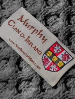 The honeycomb stitch symbolises work, and the diamonds represent a wish for wealth. This eye-catching Murphy Clan Aran wool scarf (measuring 65″ by 12″) has been produced in the traditional báinín (pronounced ‘baw neen’) colour, the natural white of the wool. It comes to you complete with Murphy clan history and crest.