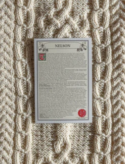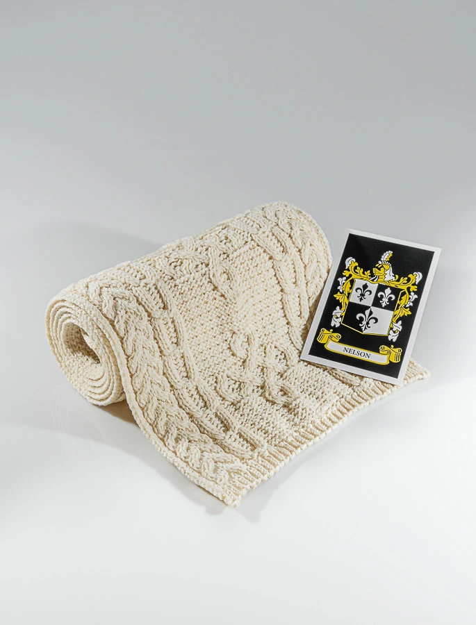 The Nelson Clan Aran Scarf is a wonderful item of Nelson heritage which will be cherished by the wearer for generations to come. Lovingly crafted from the finest 100% soft new wool, this Aran wool scarf has been created following the unique Nelson Clan Aran pattern.ย