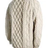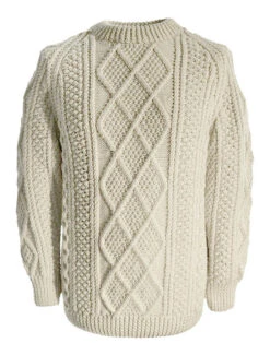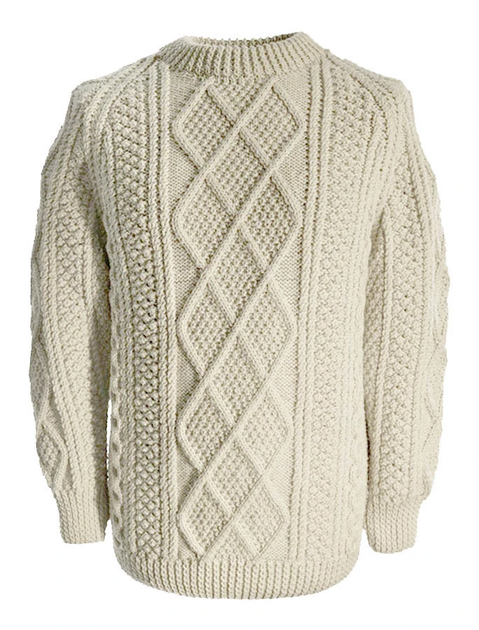 The hand knit Nolan sweater has a tree of life filled diamond as the central pattern, flanked by an unusual honeycomb stitch, trellis and tree of life on either side. In addition, the waistband is comprised of intricate tree of life patterns. The tree of life represents family unity, the honeycomb symbolises work and the trellis is symbolic of the walled fields of the Aran Islands. This beautiful Aran sweater has been hand knitted in the traditional bĂĄinĂn (pronounced âbaw neenâ) colour, the natural white of the wool. It comes to you complete with a clan history and crest. It is made of 100% pure new wool, is water repellent and breathable. It has been hand crafted in the traditional Irish style, and, with care, will last a lifetime.