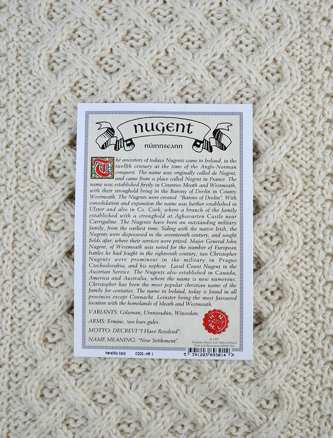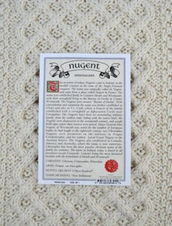The Nugent Clan Aran Throw is a precious gift for any home wherein Nugent heritage proudly resides & will be cherished by families of the Nugent name for generations to come. Lovingly crafted from the finest 100% soft new wool, this Aran throw (measuring 64″ X 40″) has been created following the unique Nugent Clan Aran pattern.