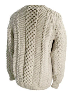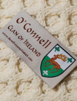 The hand knit Oâ Connell sweater has a honeycomb central panel, flanked by alternating panels of blackberry and rope on either side. The honeycomb is representative of work, the blackberry symbolises the Holy Trinity, and the rope is a wish for good luck. This beautiful Aran sweater has been hand knitted in the traditional bĂĄinĂn (pronounced âbaw neenâ) colour, the natural white of the wool. It comes to you complete with a clan history and crest. It is made of 100% pure new wool, is water repellent and breathable. It has been hand crafted in the traditional Irish style, and, with care, will last a lifetime.