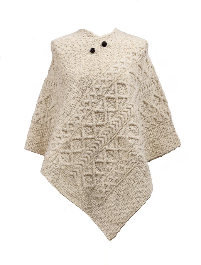 The O’ Connor Clan Poncho has a link centre stitch, flanked by cable, moss-filled diamonds and honeycomb panels on either side. The link stitch represents the unbroken chain between the Irish who emigrate and those who remain at home, cable stitch represents a wish for good luck, diamonds are a wish for wealth, and honeycomb is symbolic of work. This beautiful Aran poncho has been knit in the traditional báinín (pronounced ‘baw neen’) colour, the natural white of the wool. It comes to you complete with a clan history and crest. It is made of 100% pure new wool, is water repellent and breathable.