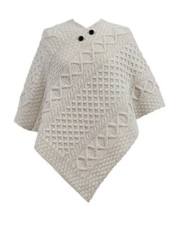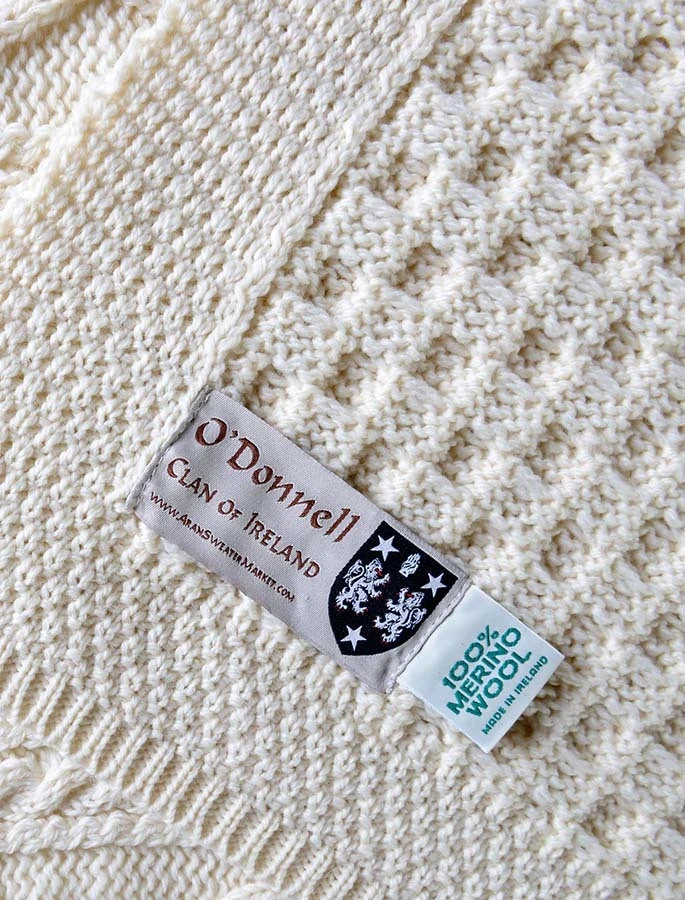 The O’ Donnell Clan Aran Poncho has a honeycomb central panel, flanked by ropes and moss-filled diamonds on either side. The honeycomb represents work, rope represents a wish for good luck, and the diamond is a wish for wealth. This beautiful Aran poncho has been knit in the traditional báinín (pronounced ‘baw neen’) colour, the natural white of the wool. It comes to you complete with a clan history and crest. It is made of 100% pure new wool, is water repellent and breathable.