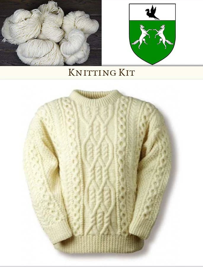 This knitting kit is comprised of the finest traditional Aran Wool, together with your Family Crest, sweater history and your O’ Donoghue knitting pattern. We provide enough Aran wool to create your perfectly sized sweater plus a little extra. This Traditional Irish 100% wool is water repellent, breathable and a delight to work with. The pattern is an easy to follow design, tailored specifically to suit your exact size requirements.