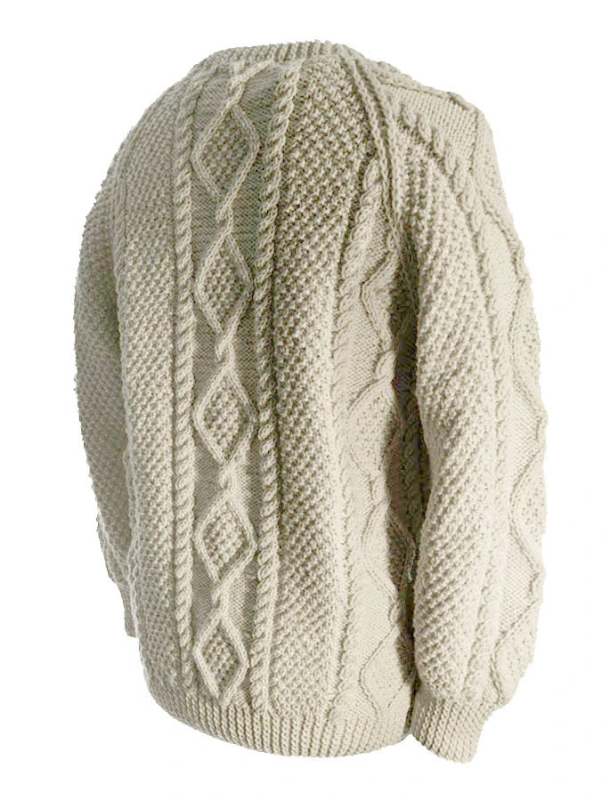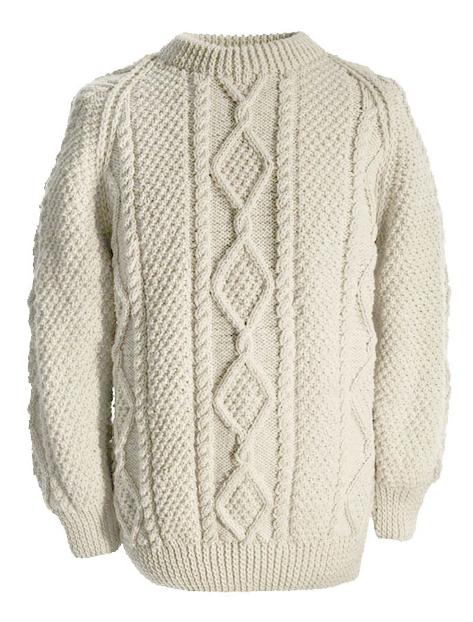 The hand knit Donovan sweater has a moss-filled diamond centre panel, flanked by rope and moss stitches on either side. This beautiful Aran sweater has been hand knitted in the traditional bĂĄinĂn (pronounced âbaw neenâ) colour, the natural white of the wool. It comes to you complete with a clan history and crest. It is made of 100% pure new wool, is water repellent and breathable. It has been hand crafted in the traditional Irish style, and, with care, will last a lifetime.