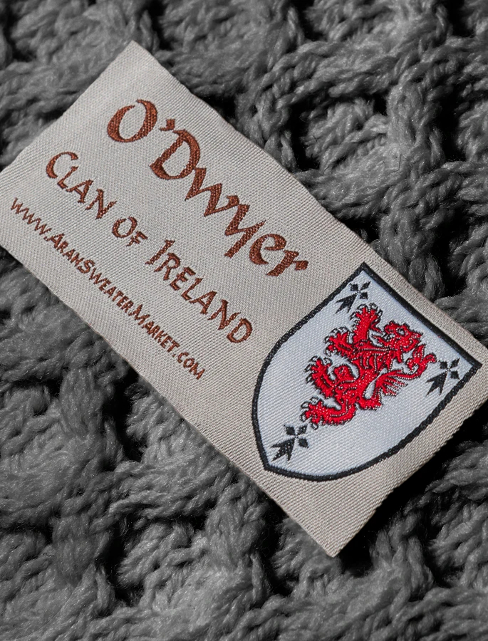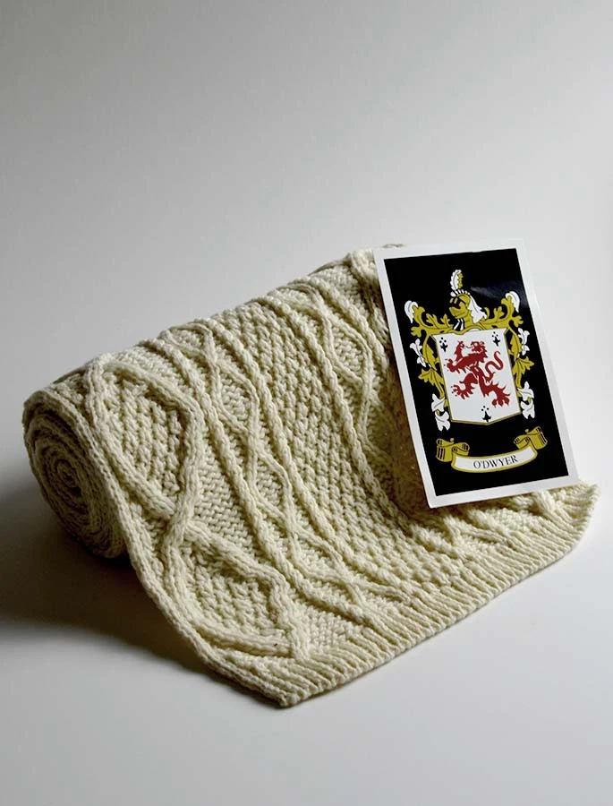 The O’Dwyer Clan Aran Scarf is a wonderful item of O’Dwyer heritage which will be cherished by the wearer for generations to come. Lovingly crafted from the finest 100% soft new wool, this Aran wool scarf has been created following the unique O’Dwyer Clan Aran pattern