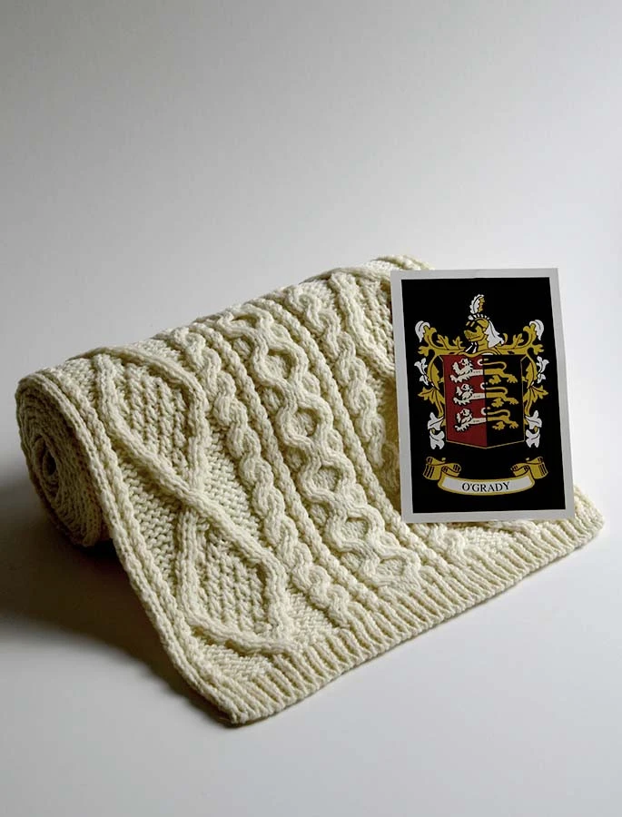 The O’Grady Clan Aran Scarf is a wonderful item of O’Grady heritage which will be cherished by the wearer for generations to come. Lovingly crafted from the finest 100% soft new wool, this Aran wool scarf has been created following the unique O’Grady Clan Aran pattern