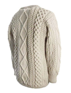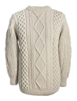 The hand knit O’ Hara sweater has a moss filled diamond as it’s central panel. This is flanked by cables and panels of honeycomb on either side. The diamonds represent a wish for wealth, the cables symbolise luck, and the honeycomb represents work. This beautiful hand knitted Aran sweater has been hand knitted in the traditional báinin (pronounced ‘baw neen’) colour, the natural white of the wool. It comes to you complete with a Clan history and crest. It is made of 100% pure new wool, is water repellent and breathable. It has been hand crafted in the traditional Irish style, and with care, will last a lifetime