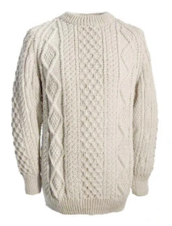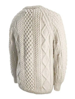 The hand knit O’ Meara sweater has a honeycomb central panel, flanked by cables and moss filled diamonds. The honeycomb stitch represents work, the cables represent a wish for luck, and the diamonds represent a wish for wealth. This beautiful hand knitted Aran sweater has been hand knitted in the traditional báinin (pronounced ‘baw neen’) colour, the natural white of the wool. It comes to you complete with a Clan history and crest. It is made of 100% pure new wool, is water repellent and breathable. It has been hand crafted in the traditional Irish style, and with care, will last a lifetime.