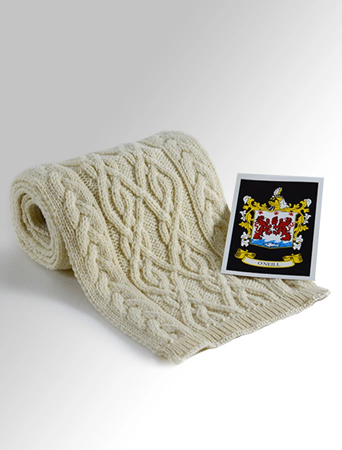 The O’Neill Clan Aran Scarf is a wonderful item of O’Neill heritage which will be cherished by the wearer for generations to come. Lovingly crafted from the finest 100% soft new wool, this Aran wool scarf has been created following the unique O’Neill Clan Aran pattern.